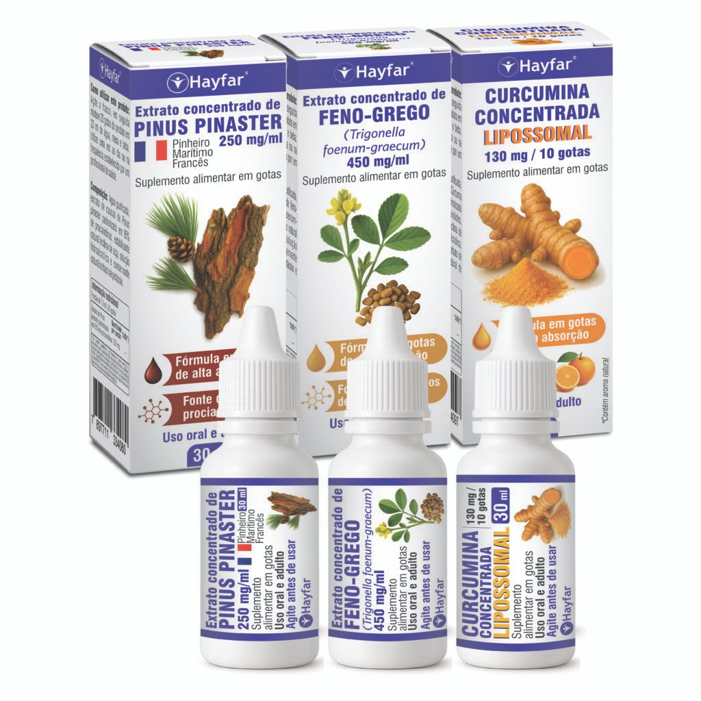 Pela manhã, em um copo contendo aproximadamente 30 ml de água, adicione 20 gotas do pinus pinaster, 30 gotas do Feno-grego e 10 gotas da Curcumina. Misture bem e beba. Tome uma vez ao dia pela manhã. AGITE OS FRASCOS ANTES DE UTILIZAR.